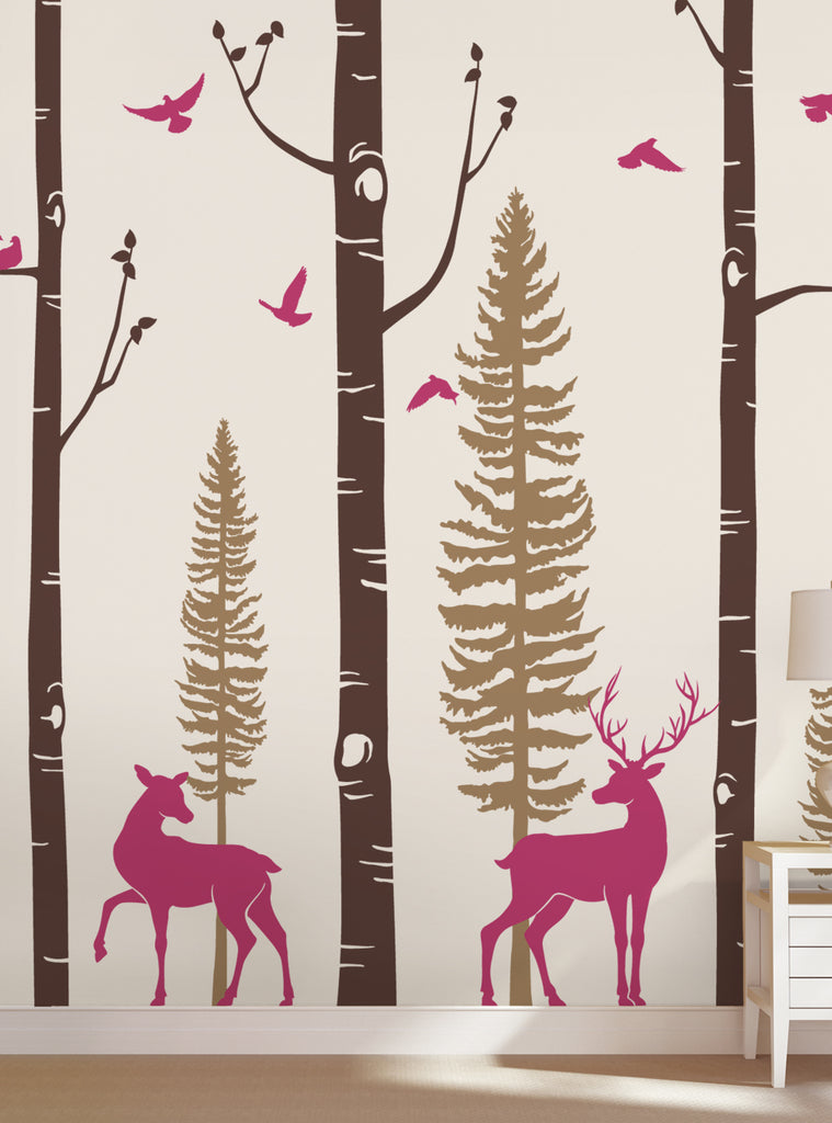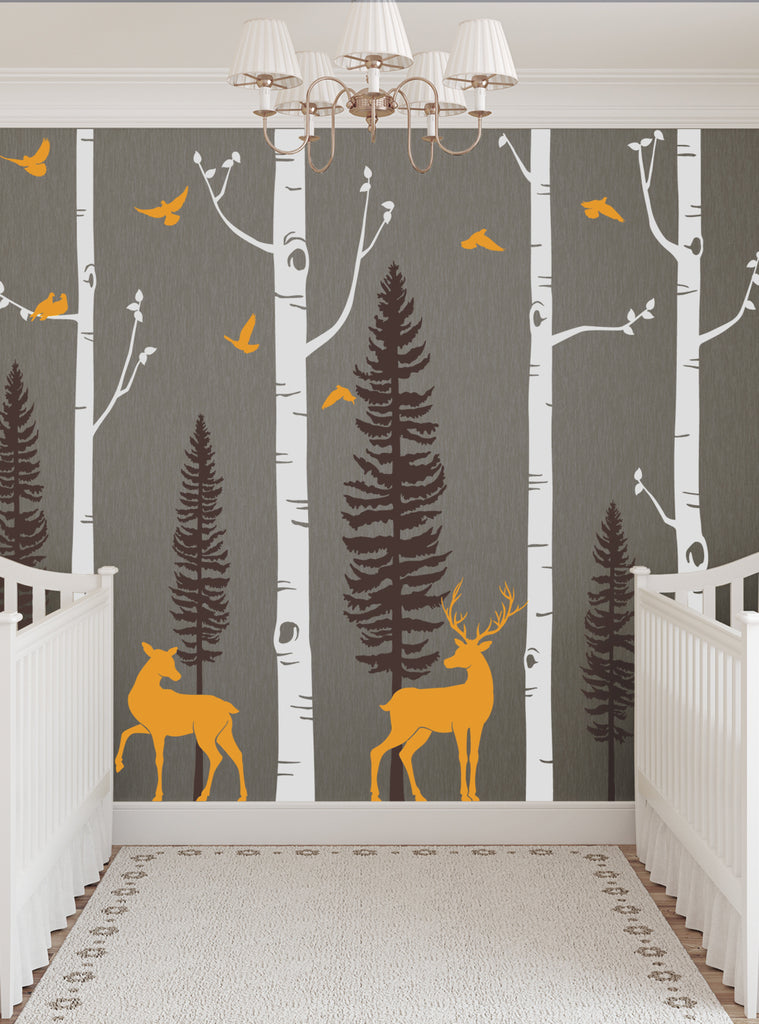 Birch Tree with Deer and Bird Wall Decals