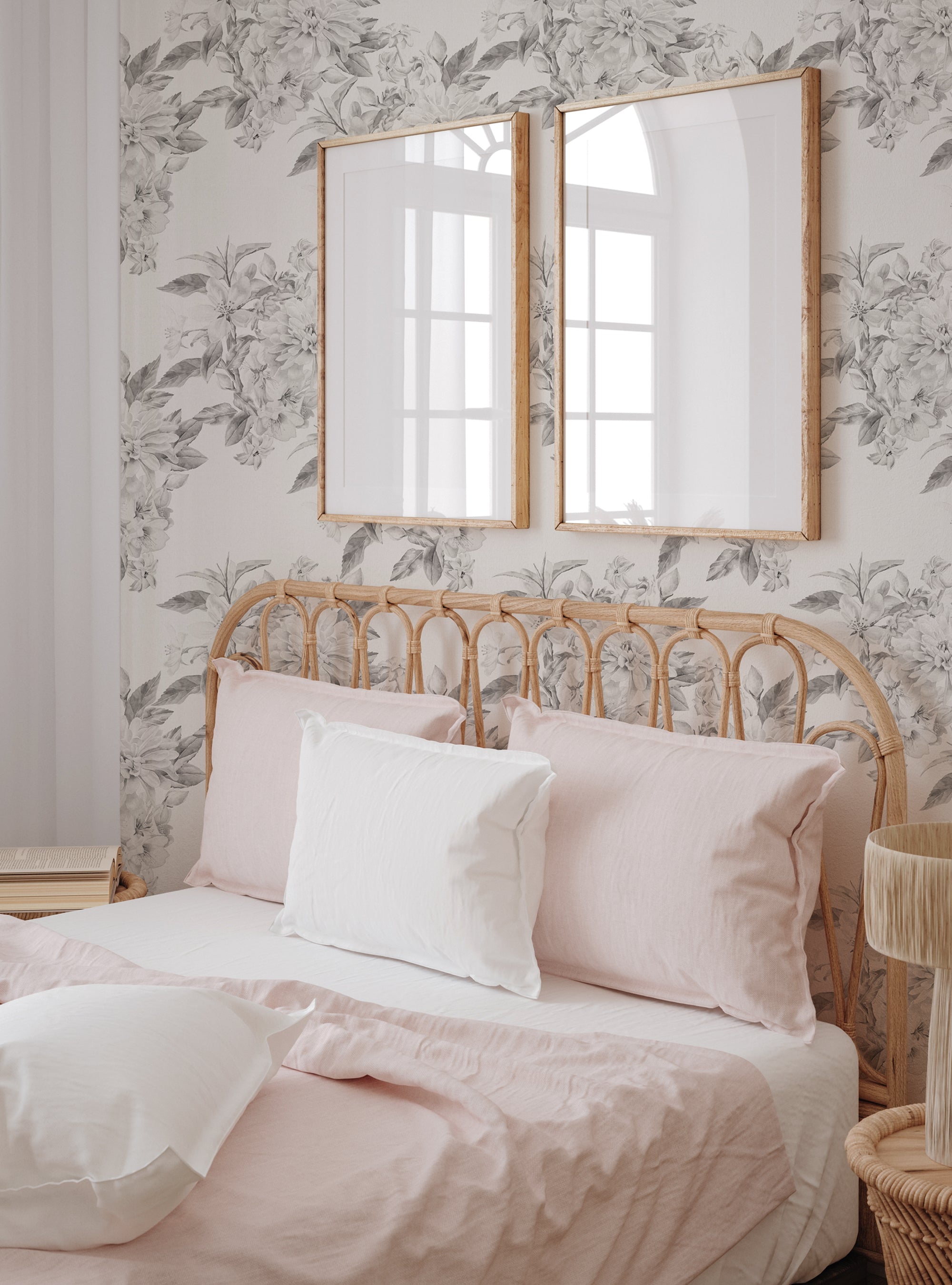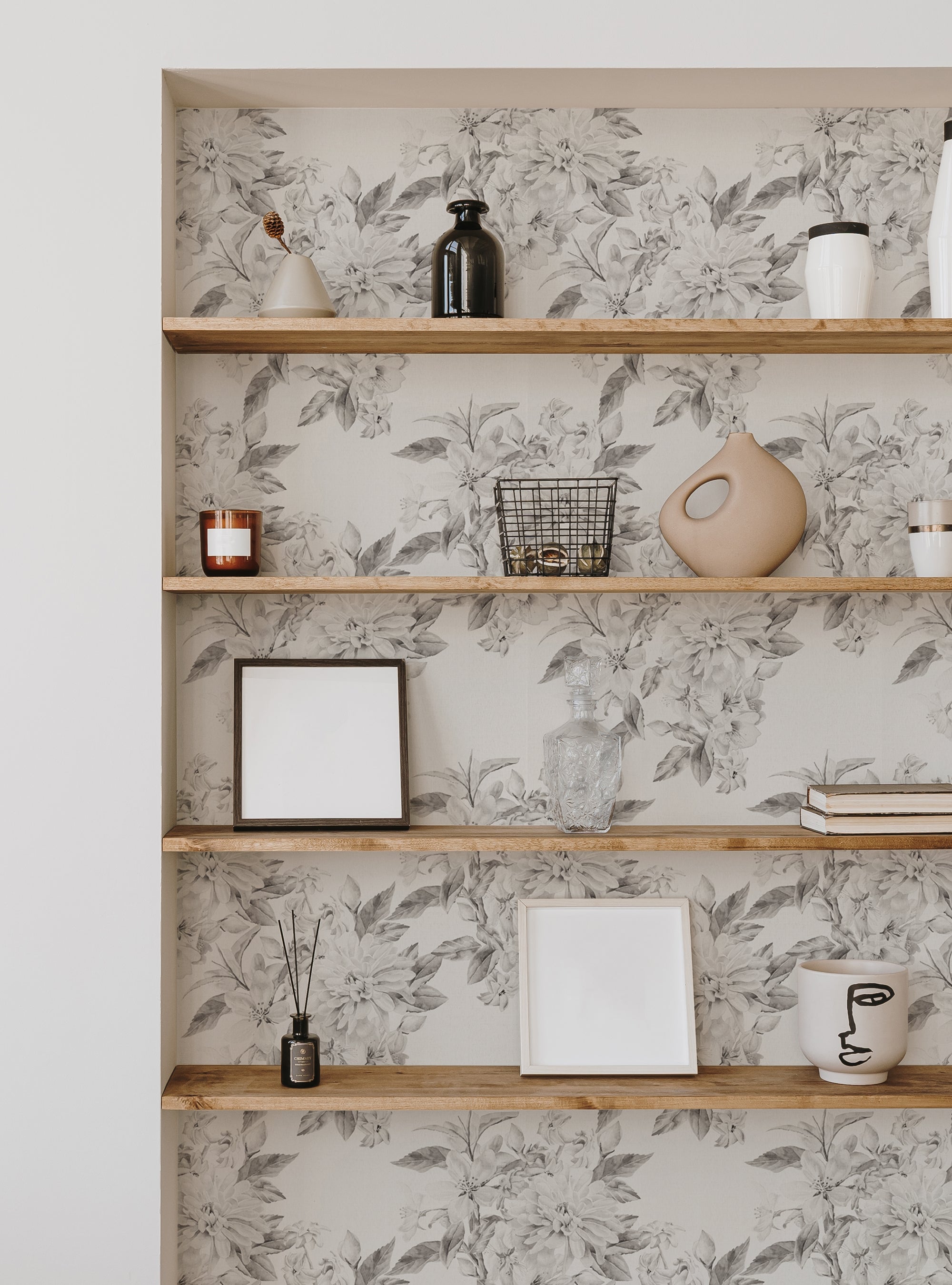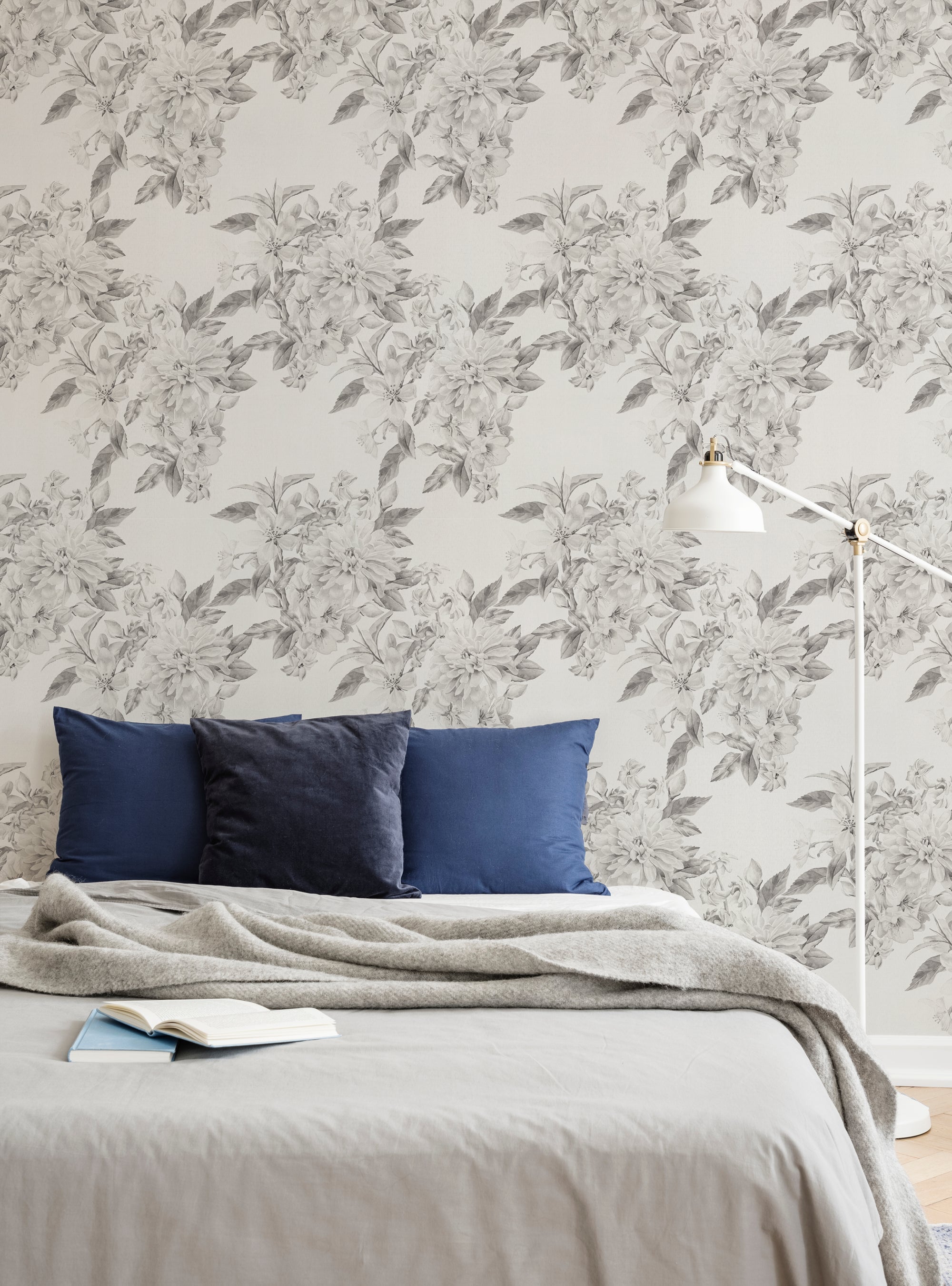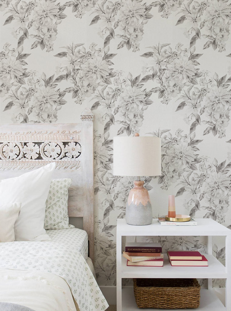 Our Black and White Floral wallpaper invites the soft, quiet beauty of blooming flowers into any room! Our wallpaper is produced on one of our three materials: Premium Fabric Peel and Stick, Vinyl Peel and Stick, and Traditional Unpasted Wallpaper.