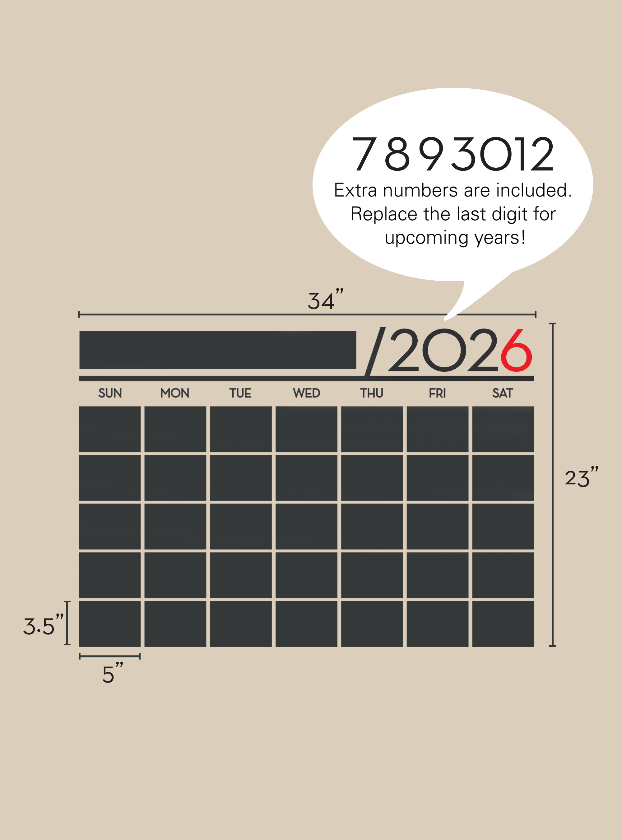 This calendar wall design incorporates a black chalkboard vinyl that you can write on with chalk or chalk ink pens (chalk ink pen not included). The decal should be applied directly to the wall.