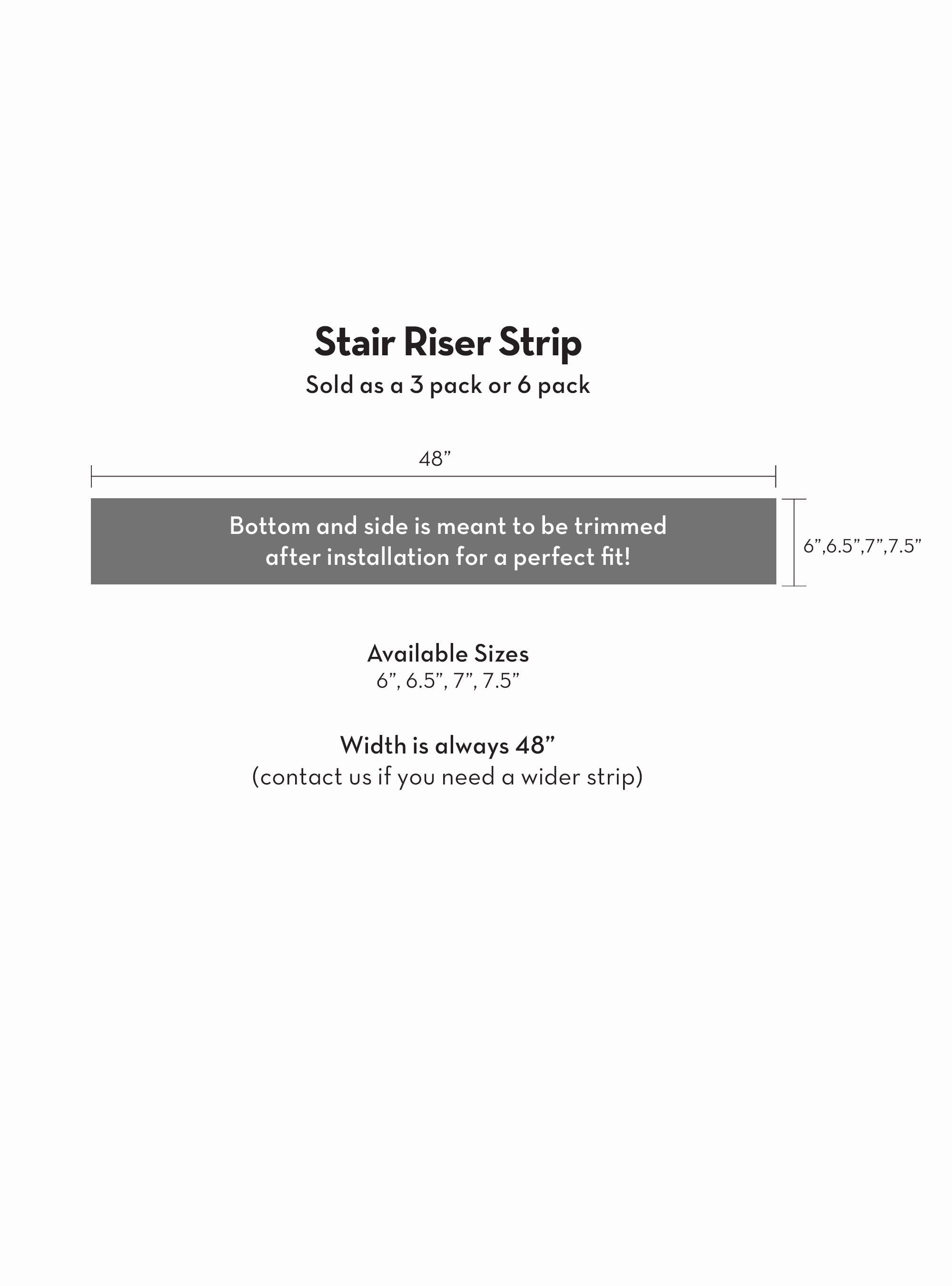 All Stair Risers are 48" in width. If you are interested in wider stair riser stickers or help assessing how many rolls you will need to purchase please reach out to us.
