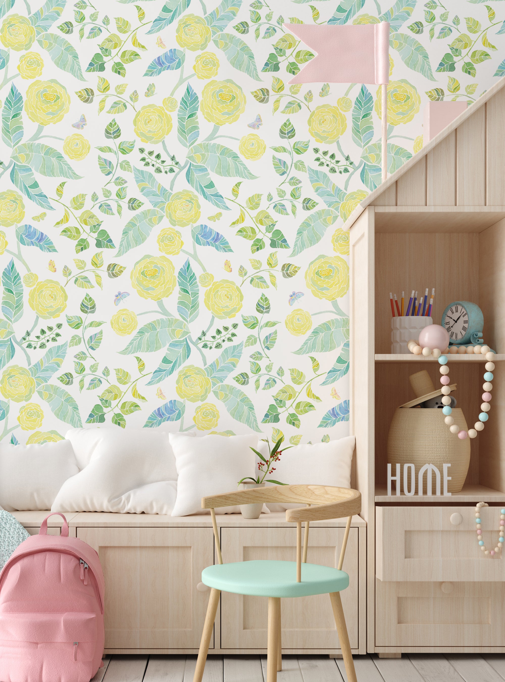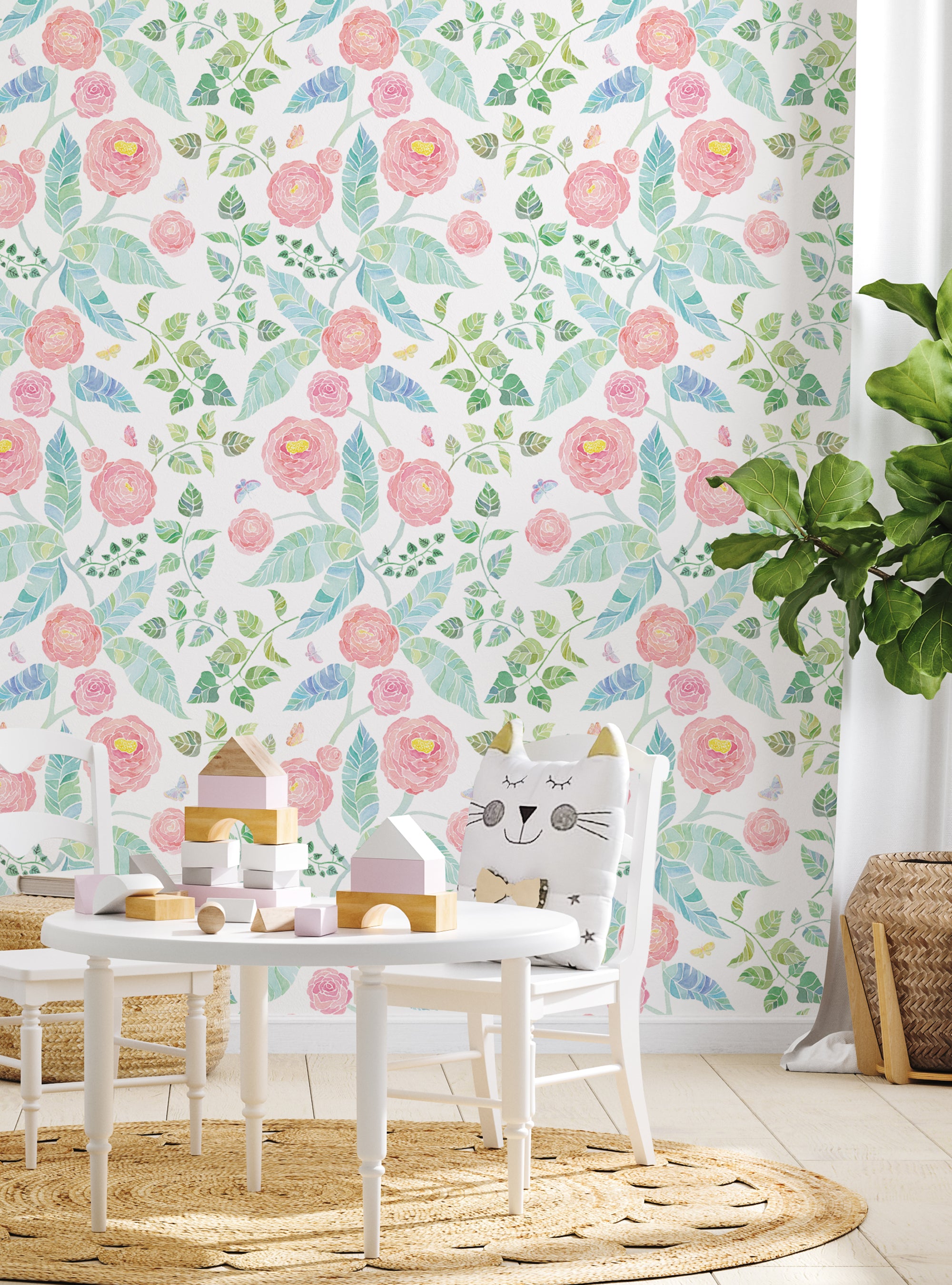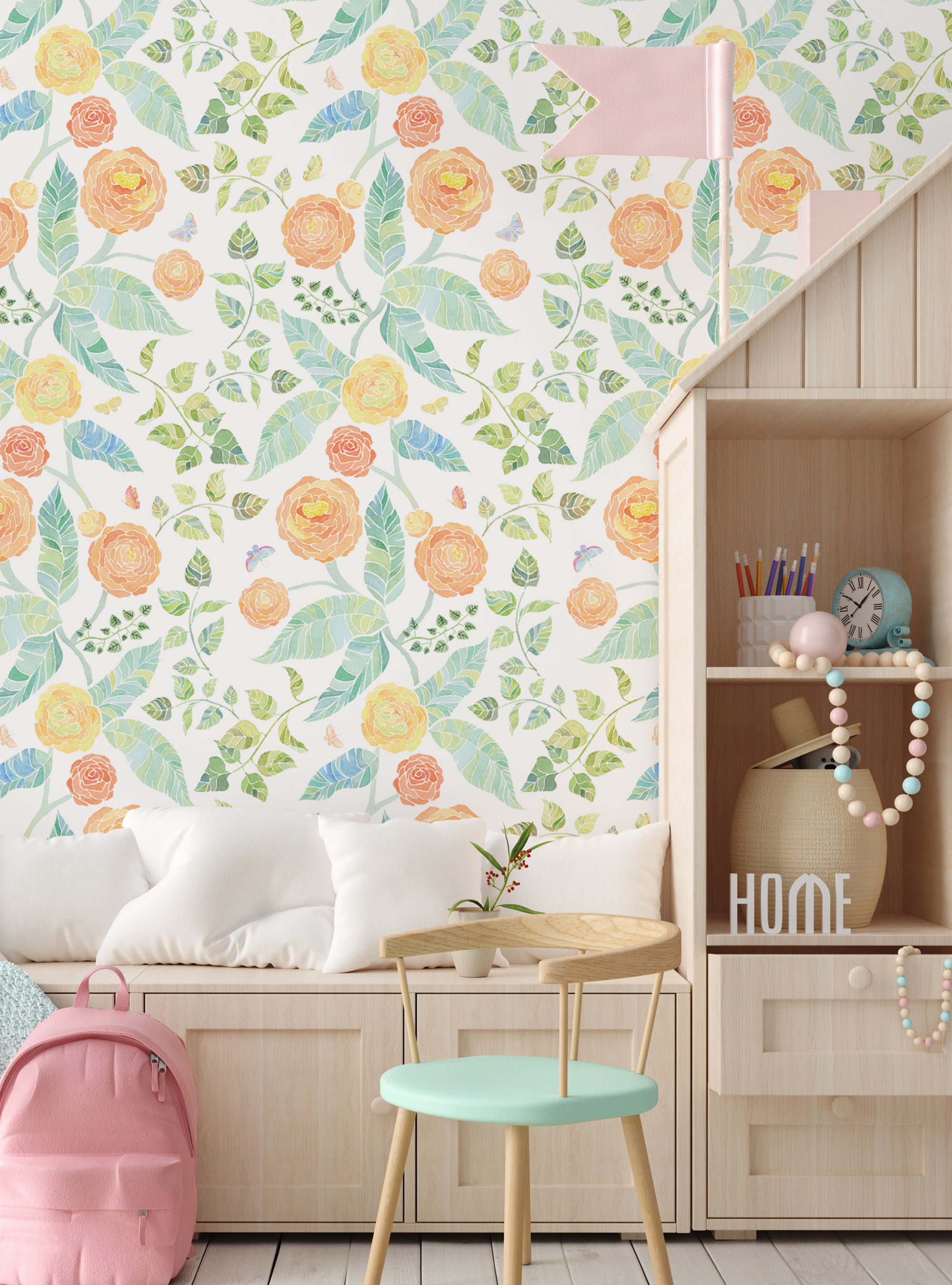 Our Spring Garden Flowers Wallpaper in cherry blossom Pink and citrus shades of Yellow and Orange adds a bright and cheery flair to any room. The no fuss, no muss application is ideal for DIY room makeovers.