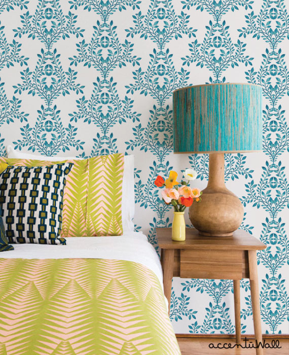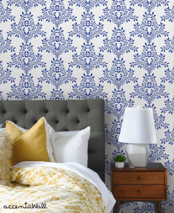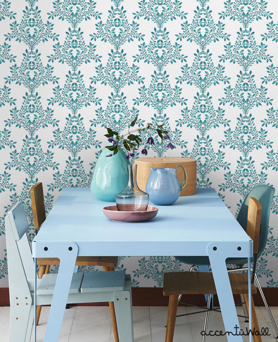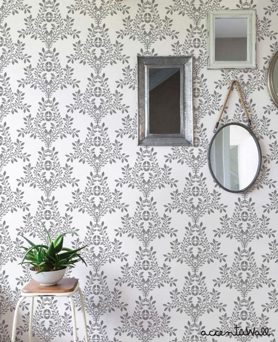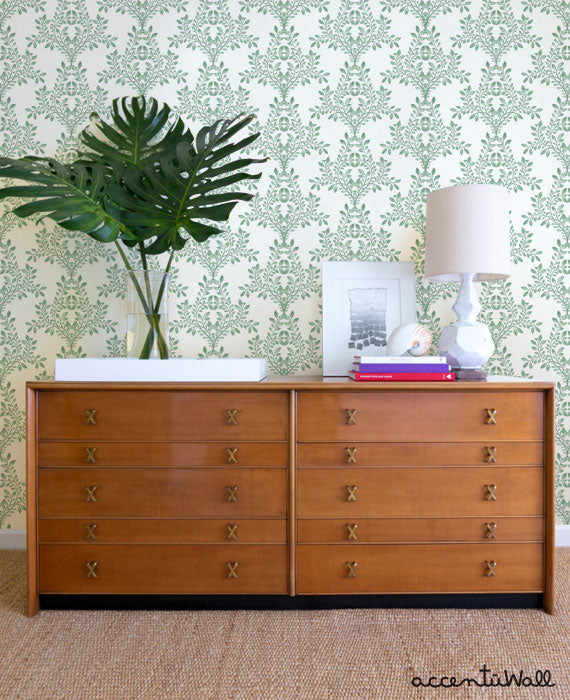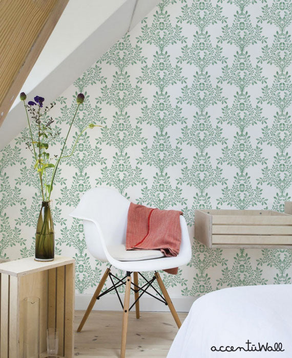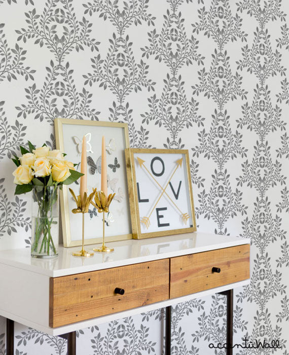 Damask Leaves peel & stick wallpaper. The designs are printed onto an adhesive backed material that can be removed, repositioned and reused over and over again. They do not leave any residue on your walls and are ideal for DIY room makeovers without the mess and headaches of traditional wallpaper.