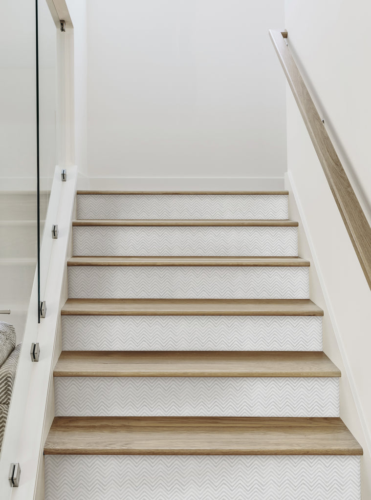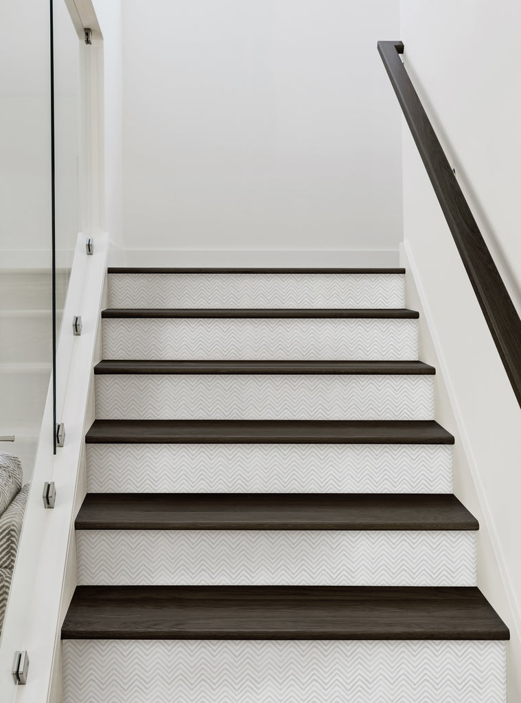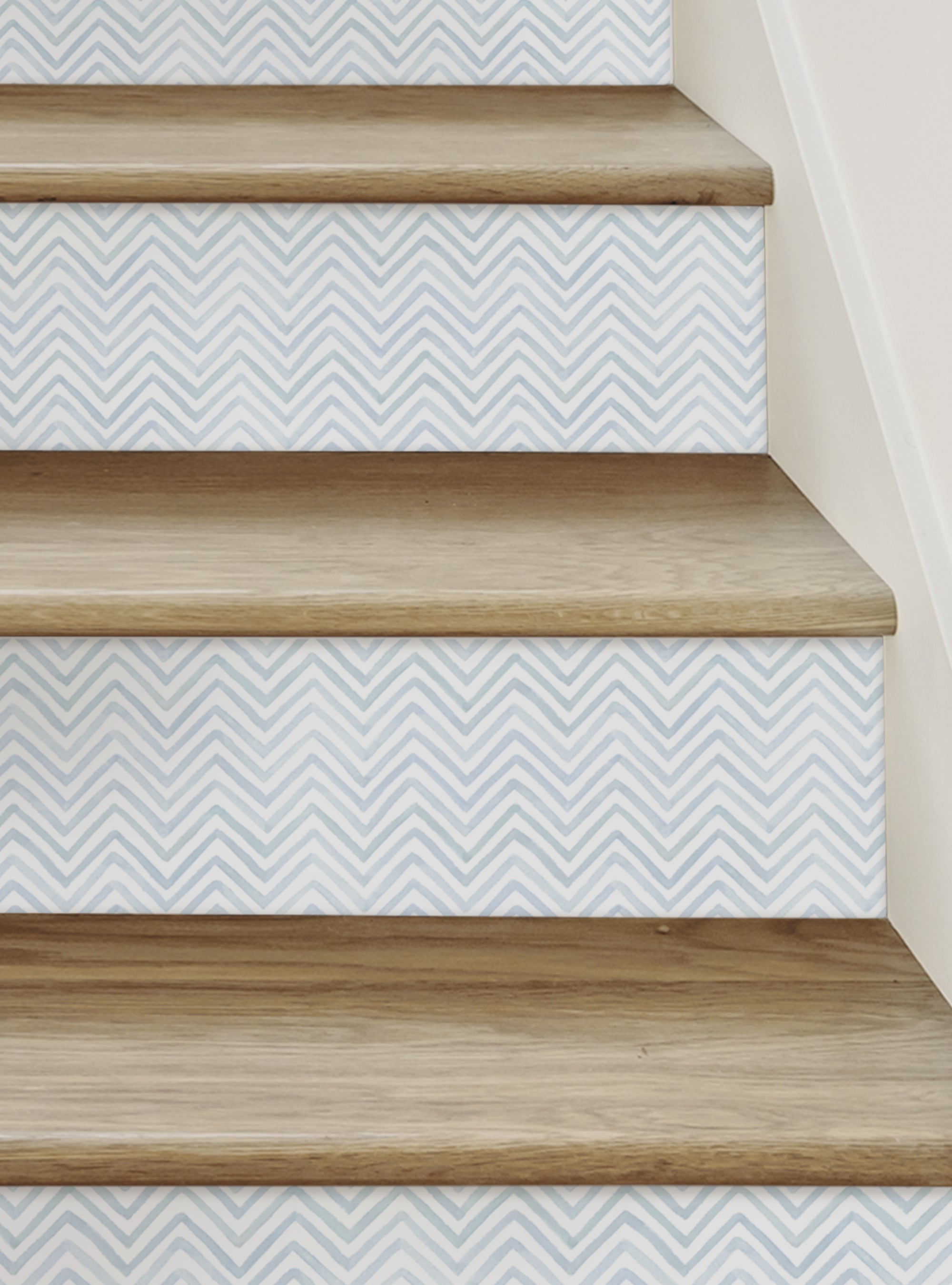 Nos bandes de contremarche à décoller et à coller en chevron aquarelle sont un moyen simple mais audacieux de relooker vos escaliers !