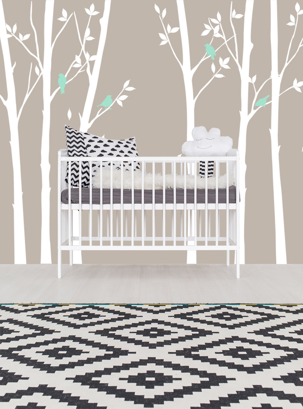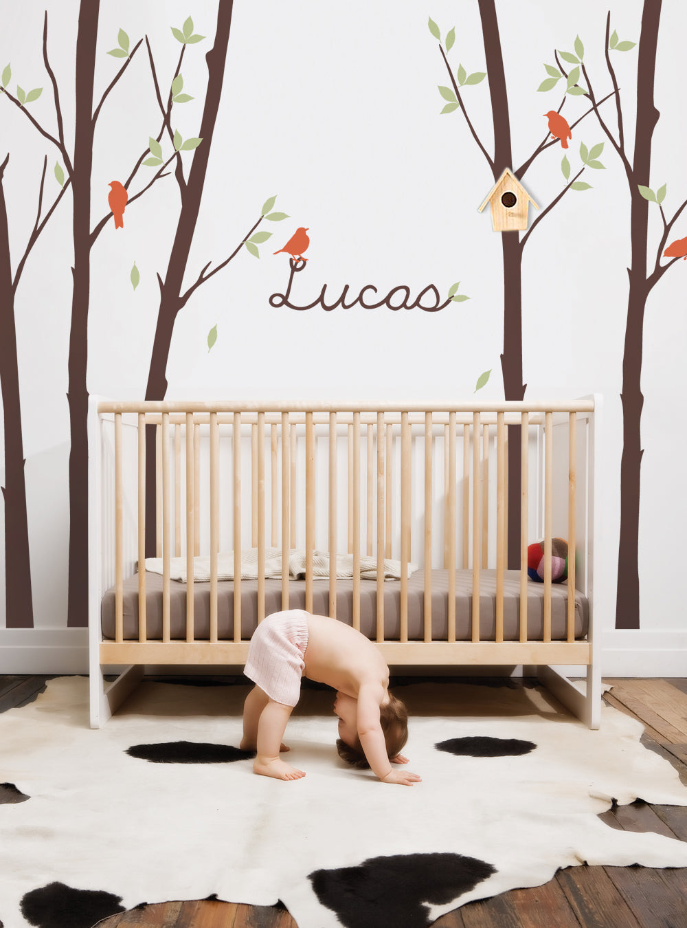 Ajoutez une touche de nature dans la chambre de votre bébé avec notre collection d'arbres avec des feuilles, des oiseaux et un autocollant personnalisé. (Autocollant offert avec ou sans nom.)