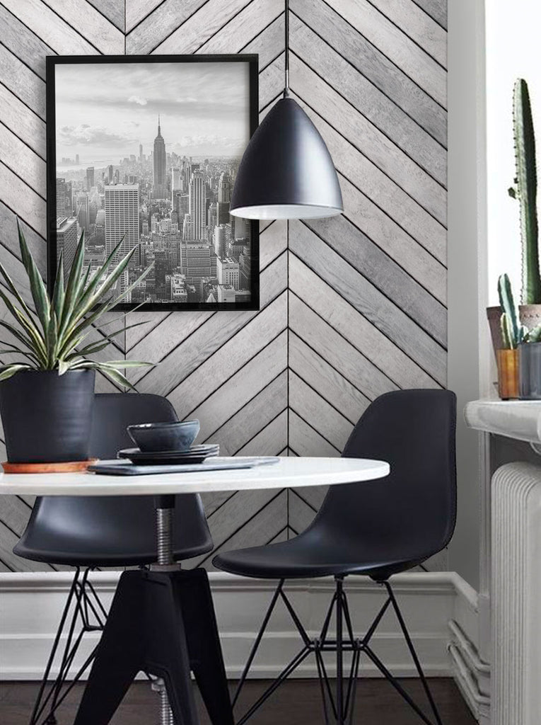 Papier peint mural avec accents de bois gris et blanc à chevrons - Peel and Stick