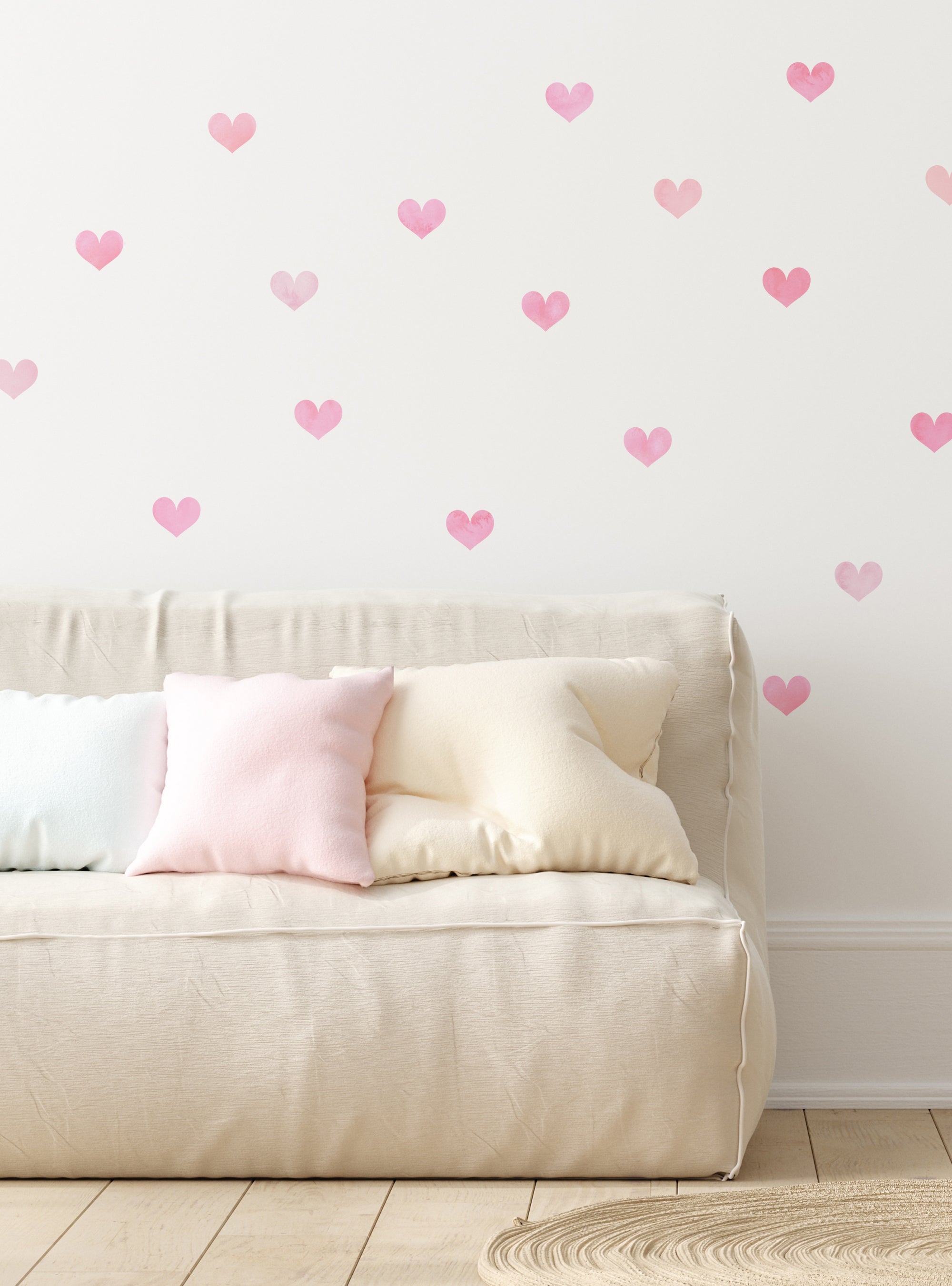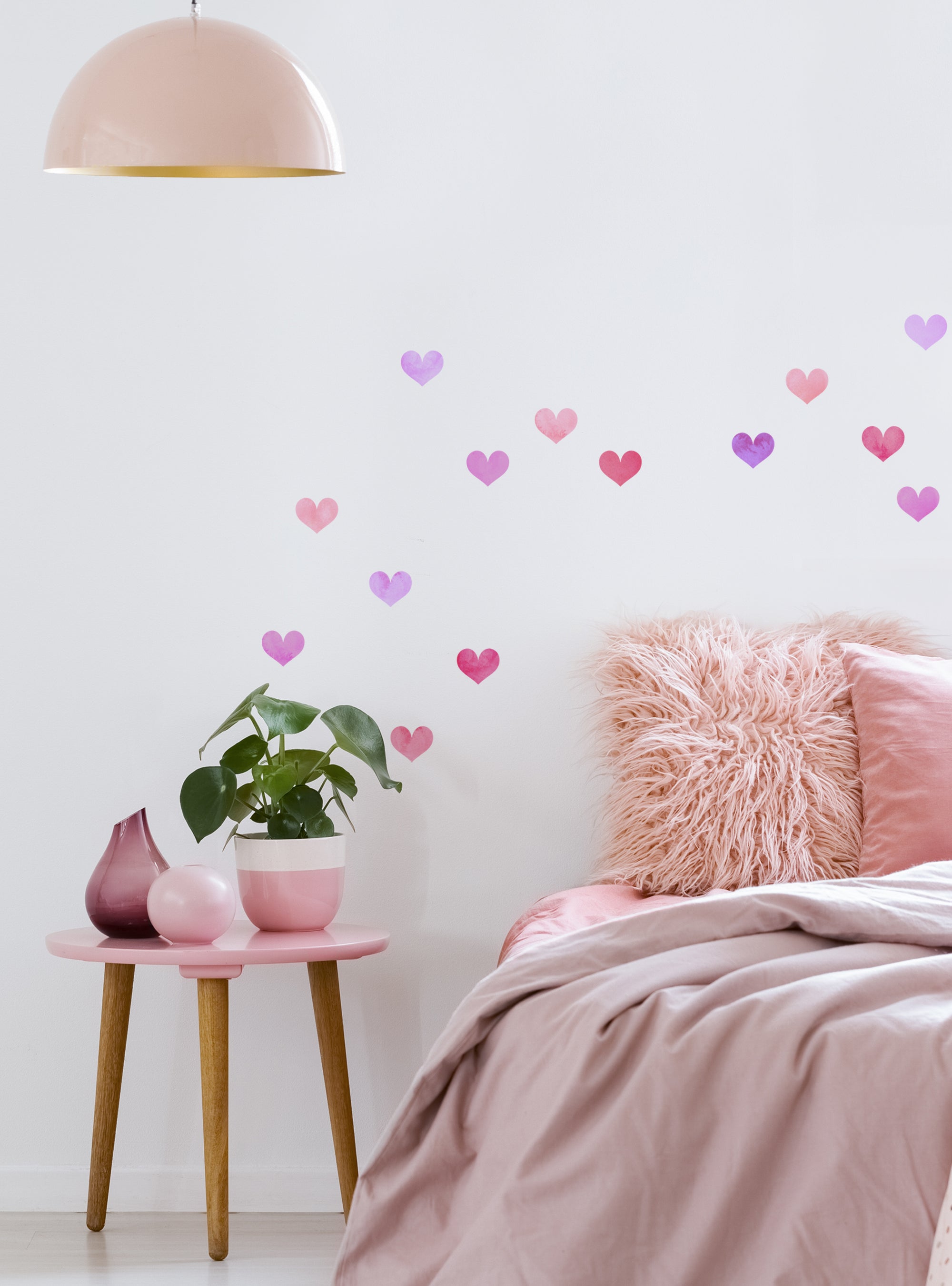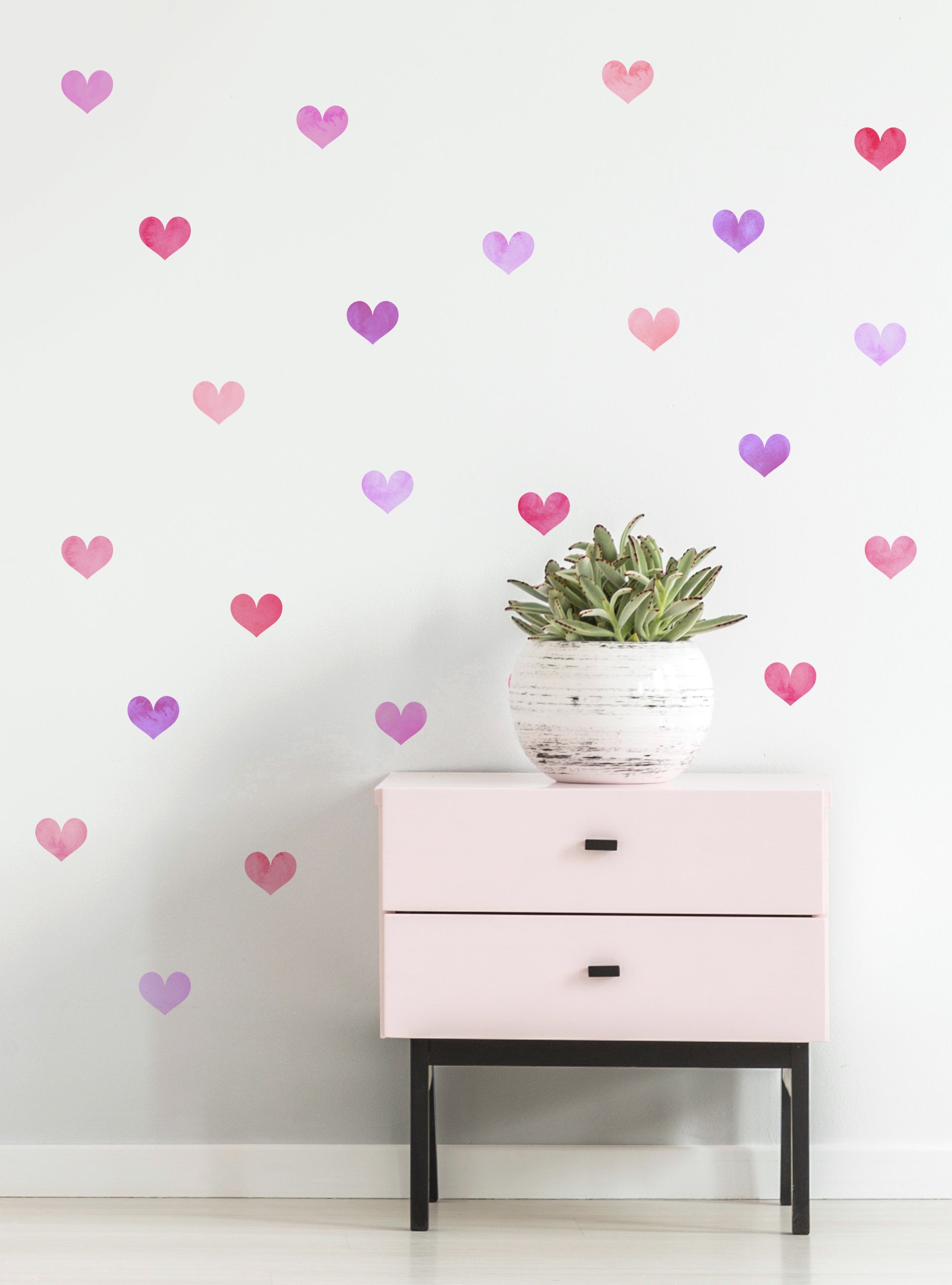 Autocollants muraux aquarelle coeurs, autocollants muraux roses, peler et coller