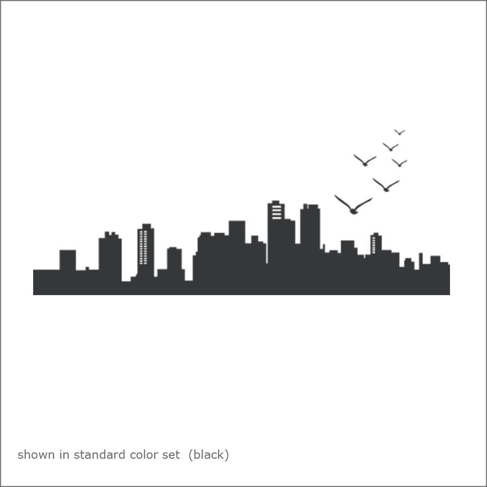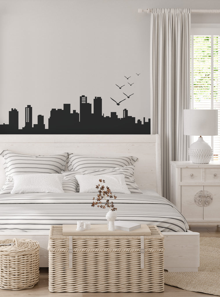Une silhouette solide d’un horizon urbain moderne. Ajoutez ce design élégant au mur de votre salon ou de votre chambre !