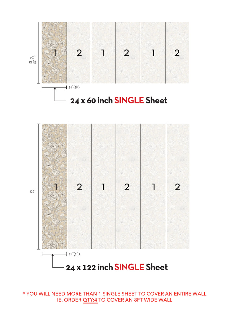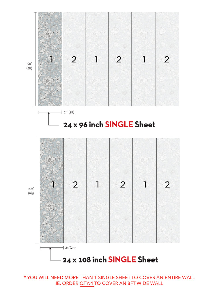• Please note, this pattern repeats horizontally across multiple panels.  If placing a multi roll order with different sizes (ie. (2) 24 x 96 inch rolls and (3) 24 x 108 inch rolls), please provide detailed panel number / roll size information in the notes section during checkout.  For example: (panel 1 and 2 for the 96 inch rolls and panel 3,4,5 for the 108 inch rolls).  Without this information your order may be delayed.