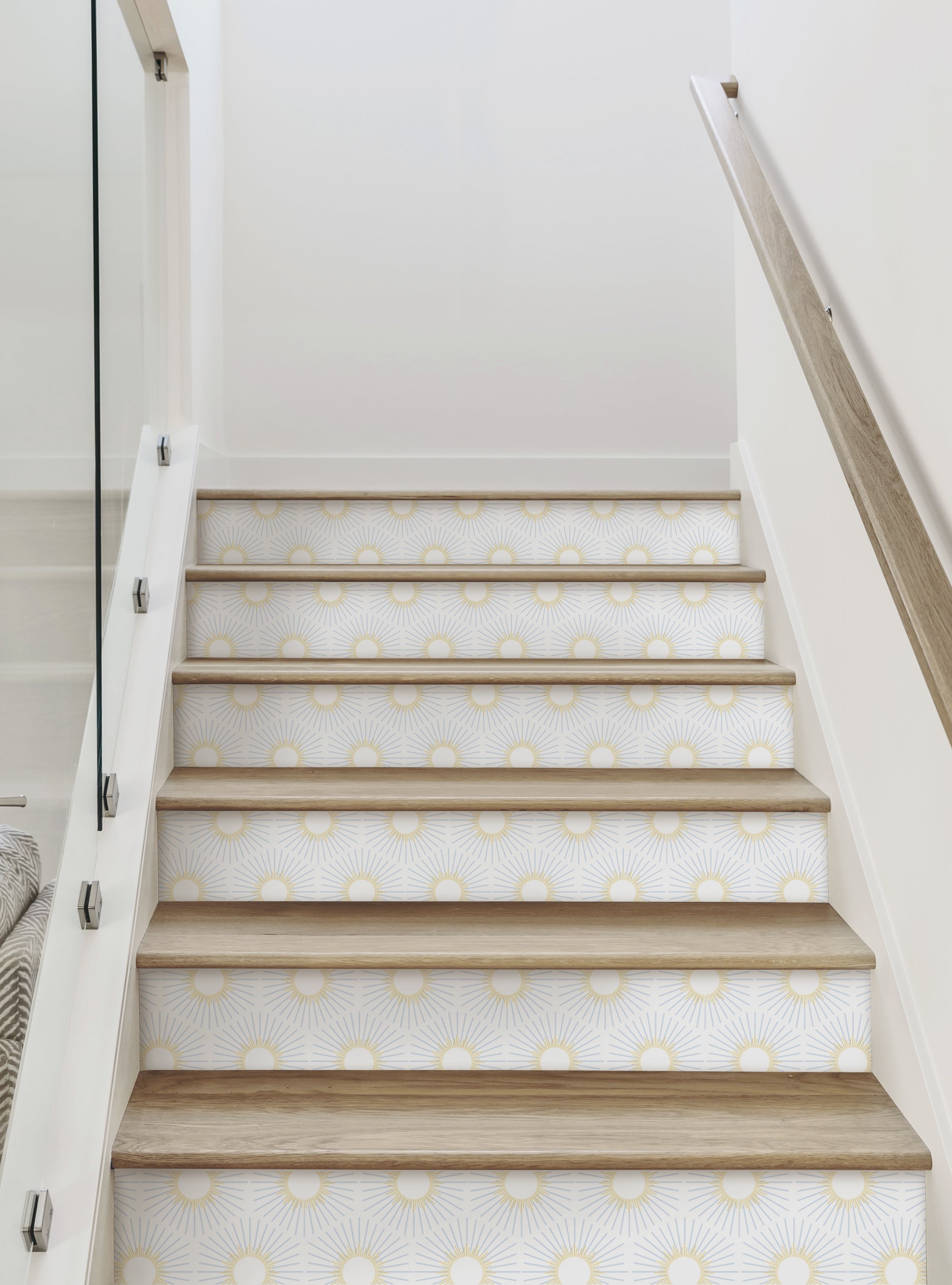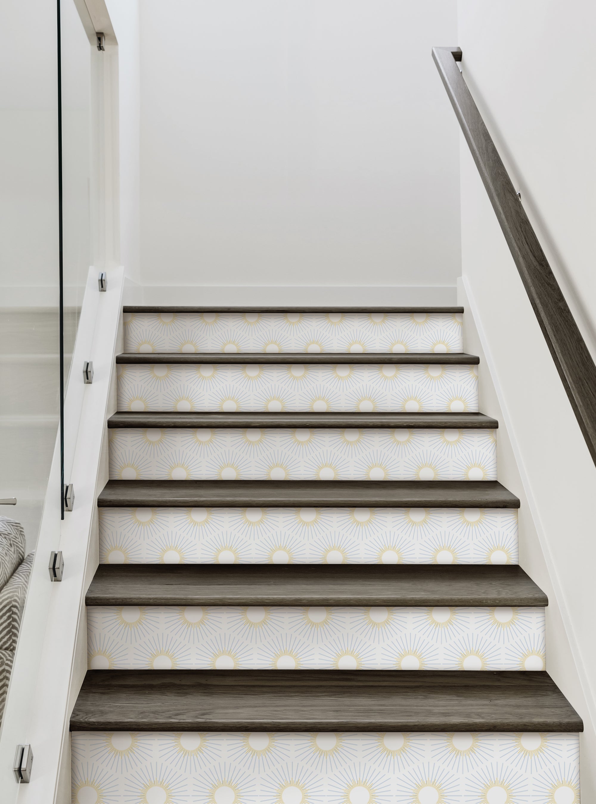 This Sunburst peel and stick stair riser strip gives a bright and cheery look. DIY decorating is also easier with this repositionable vinyl that can be easily applied and removed without any stress or mess!