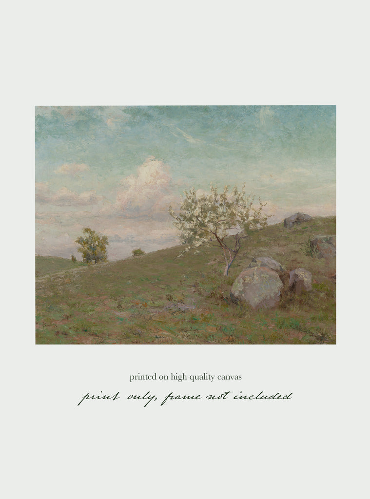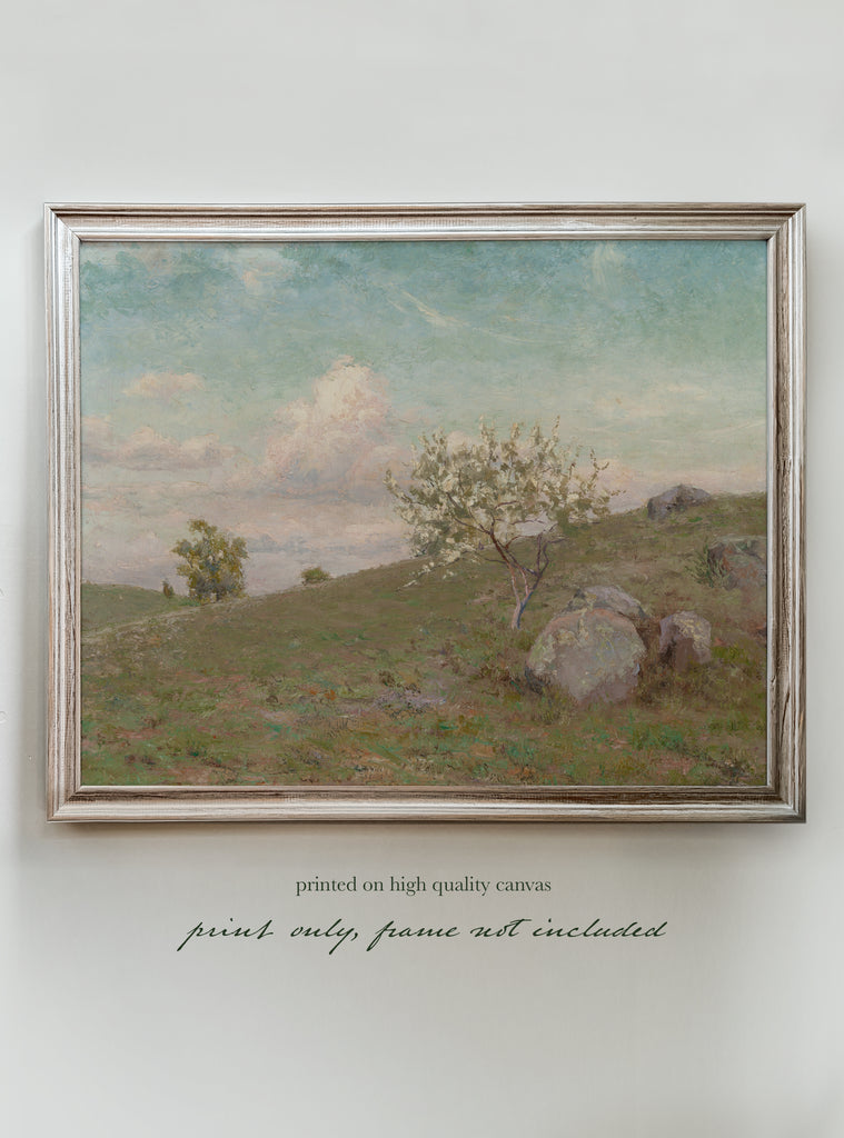 Brighten your space with this enchanting Hillside Landscape Art Print, expertly printed on high-quality canvas. This serene meadow scene captures the beauty of nature, featuring delicate blossoms and lush greenery that evoke a sense of tranquility and renewal.