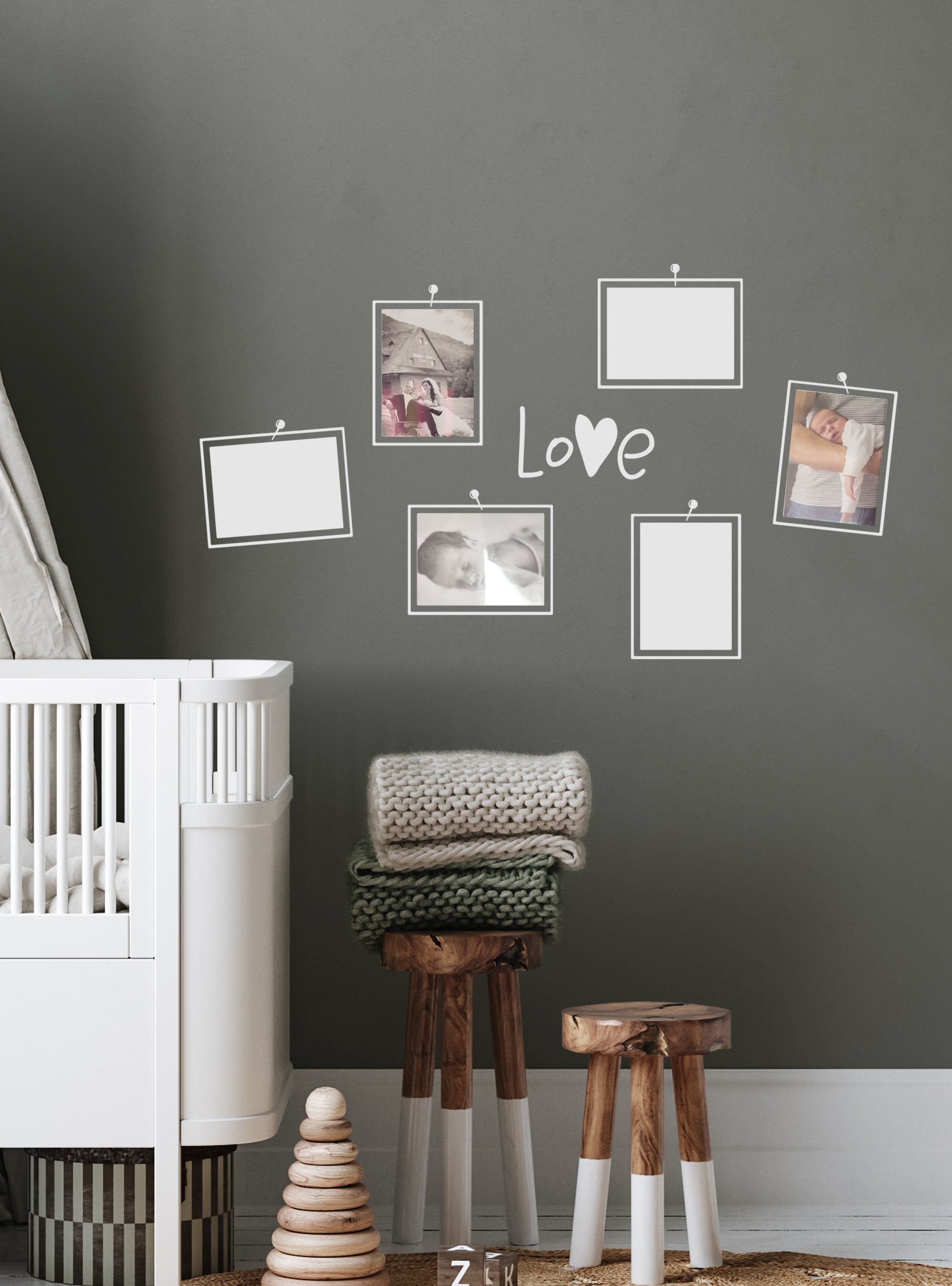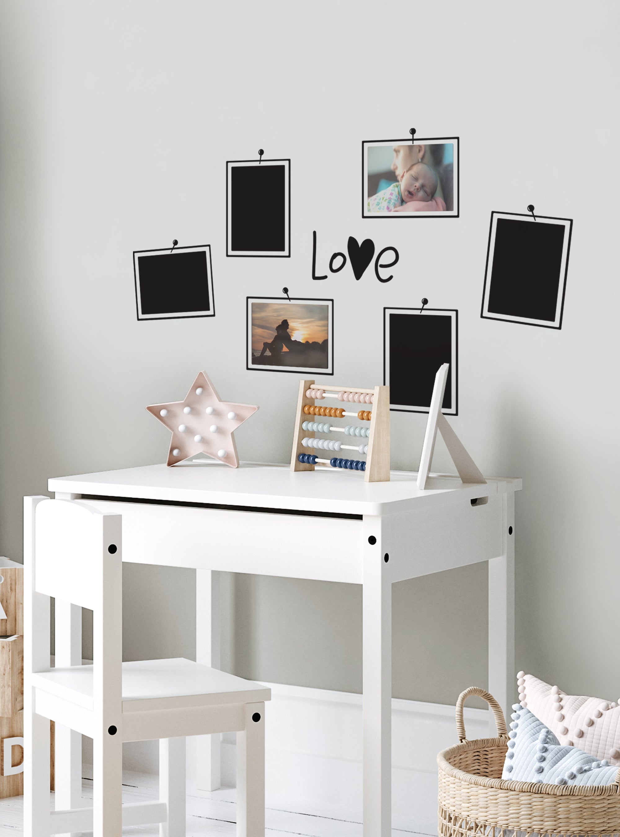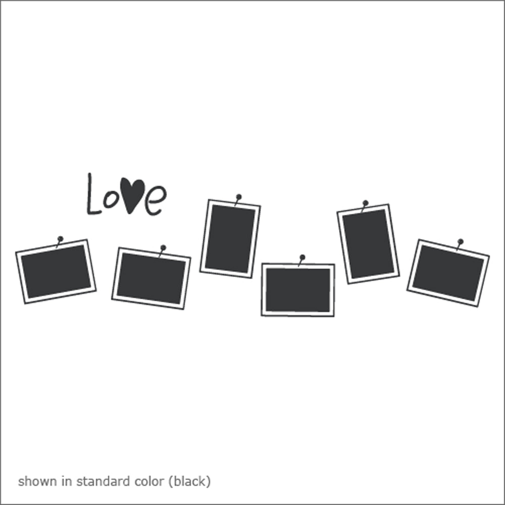 The vinyl decal acts as your photo frame. Just apply the decal on the wall in any arrangement that you want, then take a 4x6 photo and stick it to the vinyl frame using sticky dots or double sided tape. Also offered in 5x7 size.