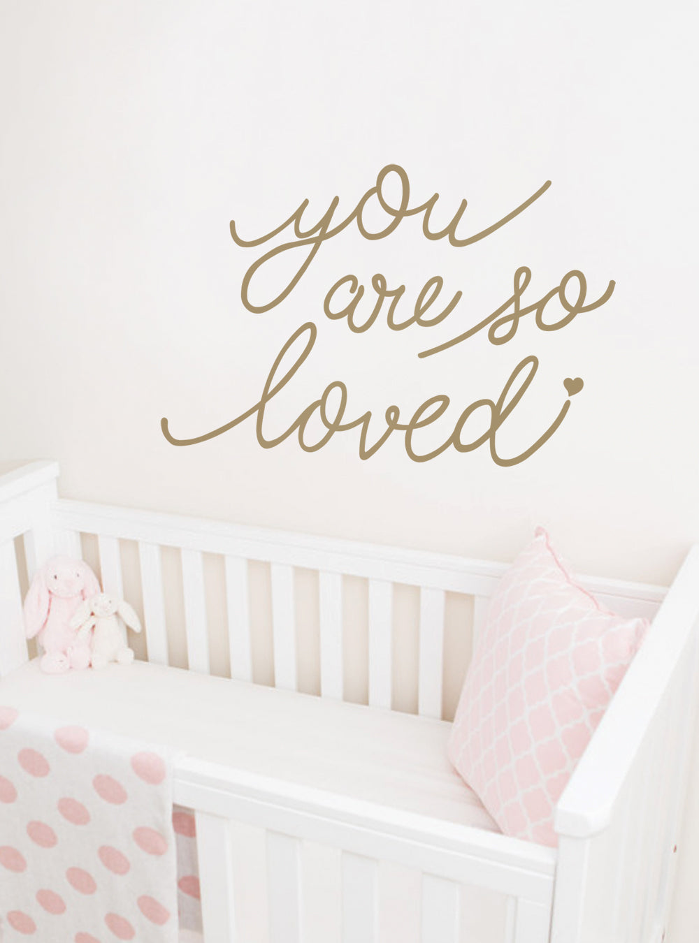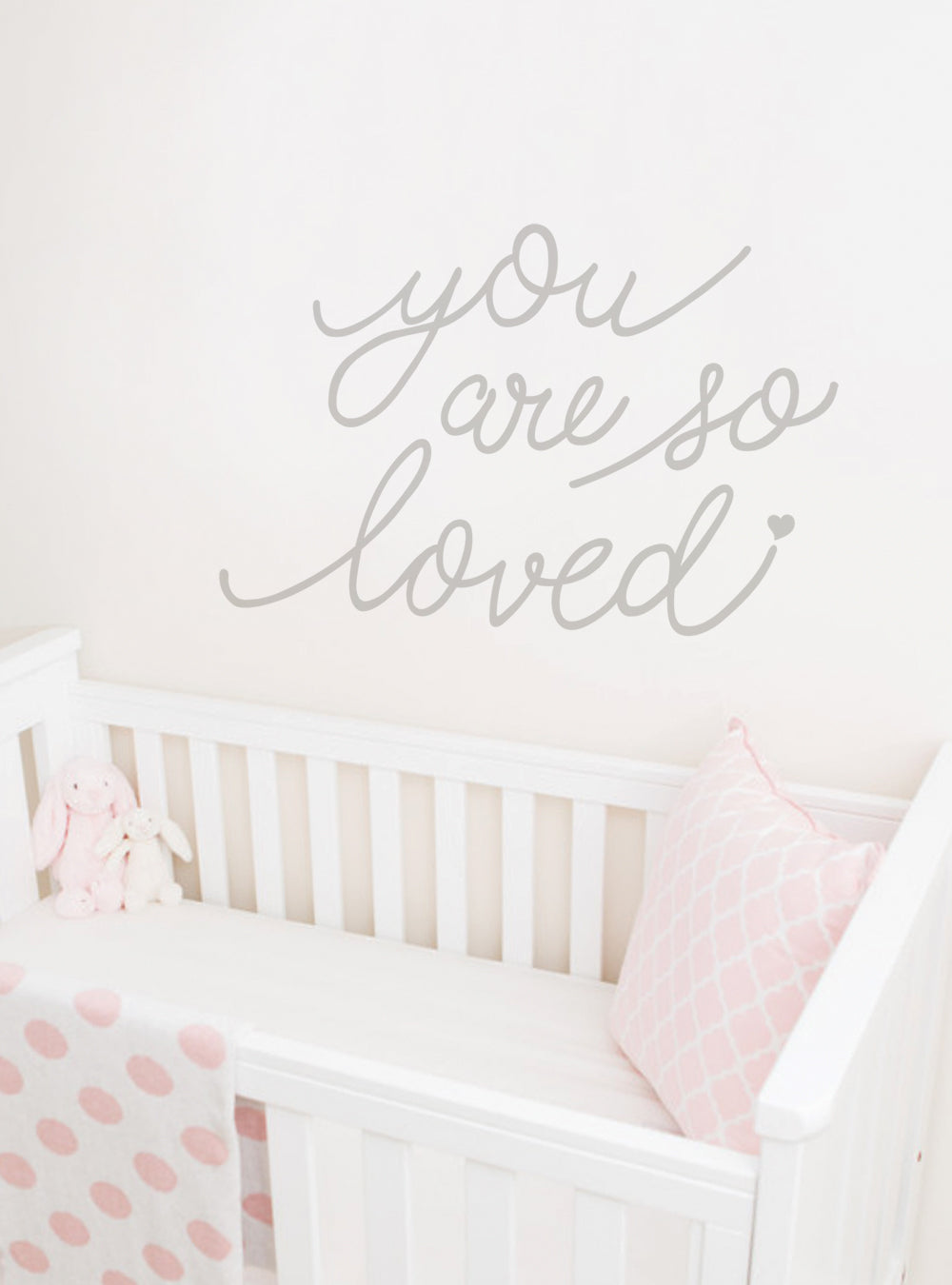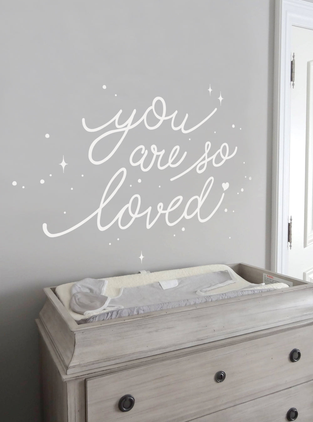 Our adorable "You Are So Loved" wall decal is the perfect finishing touch for kid's bedrooms and baby nurseries! The set also includes dots, diamonds, and one heart decal which are all separate pieces (feel free to apply all, a few, or none at all - it's your choice!).